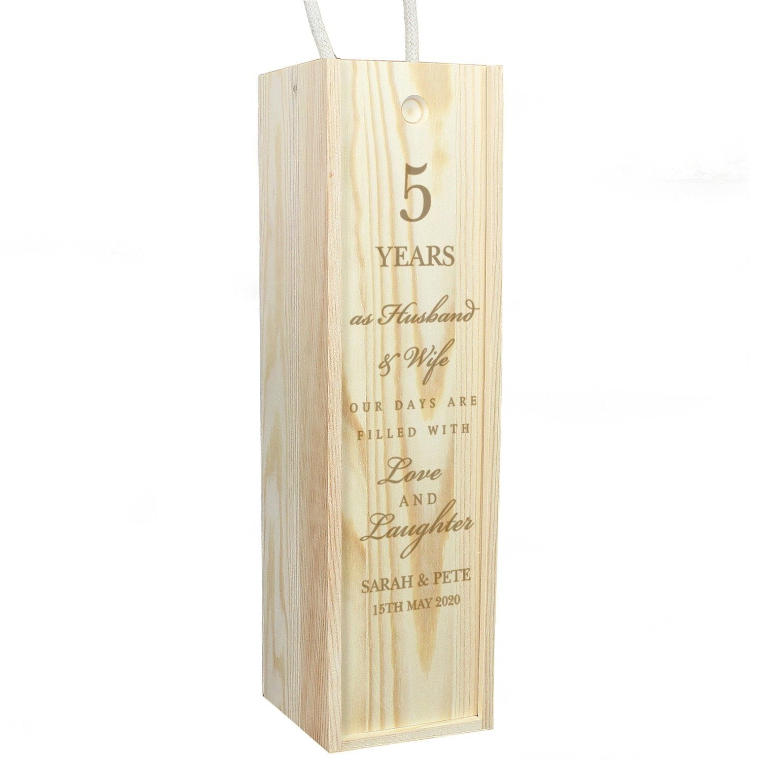 Celebrate your anniversary with this personalised wooden wine bottle box. Perfect for a special gift, this presentation box lets you create a unique message across six lines. The first line allows two characters (ideal for the number of years you've been together), the second line ten characters, lines three and four fifteen characters each, and lines five and six twenty-five characters each. Note that lines three and four will not be in capitals. The phrase Our days are filled with Love & Laughter is included.