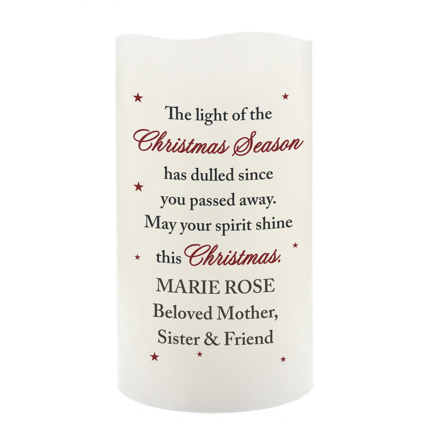 This personalised Christmas season memorial LED candle offers a comforting way to remember a loved one during the festive season. Personalise it with up to three lines of text; the first line will be in uppercase. A heartfelt message, The light of the Christmas Season has dulled since you passed away. May your spirit shine this Christmas, is included.