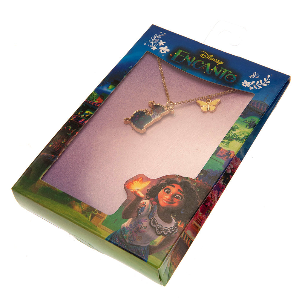 Show your love for Encanto with this beautiful fashion jewellery necklace. A charming Mirabel pendant hangs from a gold-coloured chain, complemented by a delicate butterfly charm.