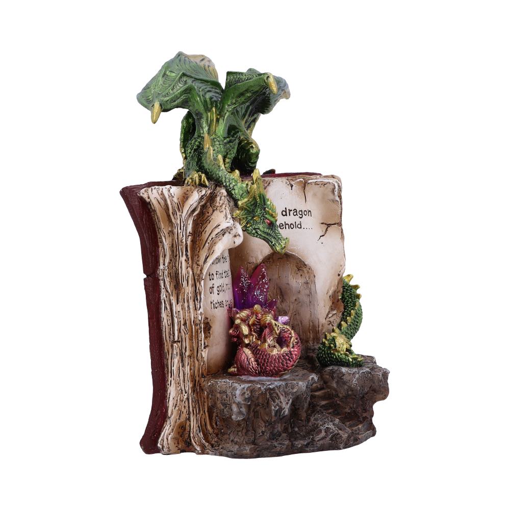 This magnificent hoard finders dragon figurine from Nemesis Now is a captivating addition to any collection. A large emerald dragon rests dramatically atop an antique book, its pages intricately carved with a staircase leading to a fuchsia crystal. A smaller red dragonling guards this book crystal. The book itself bears the inscription "Follow the stairs to find treasures of gold, more riches and jewels than a dragon could behold".