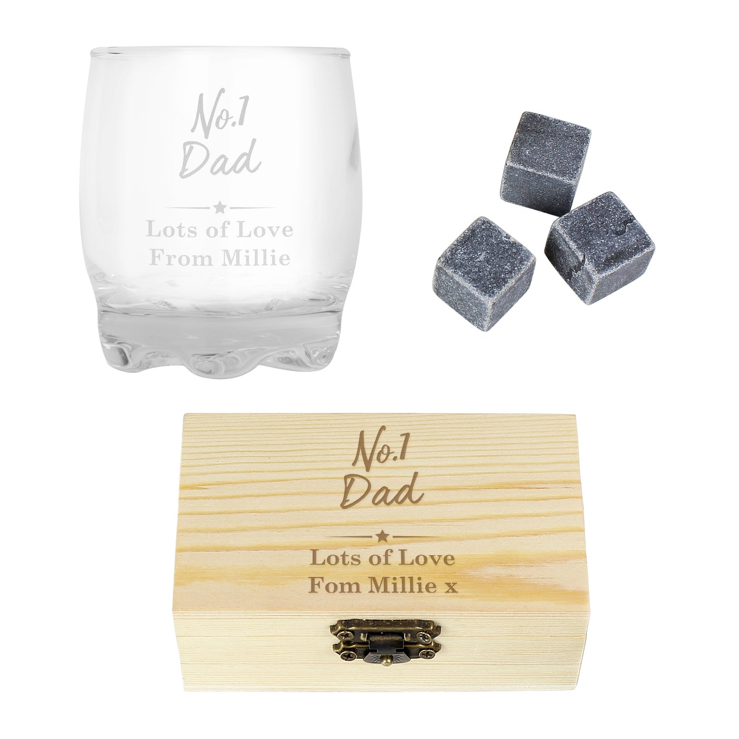 Personalise the wooden box and glass with two lines of text: Line 1 up to 12 characters long, Line 2 up to 15 characters long. No.1 is pre-printed. Please avoid using capital letters for better readability.