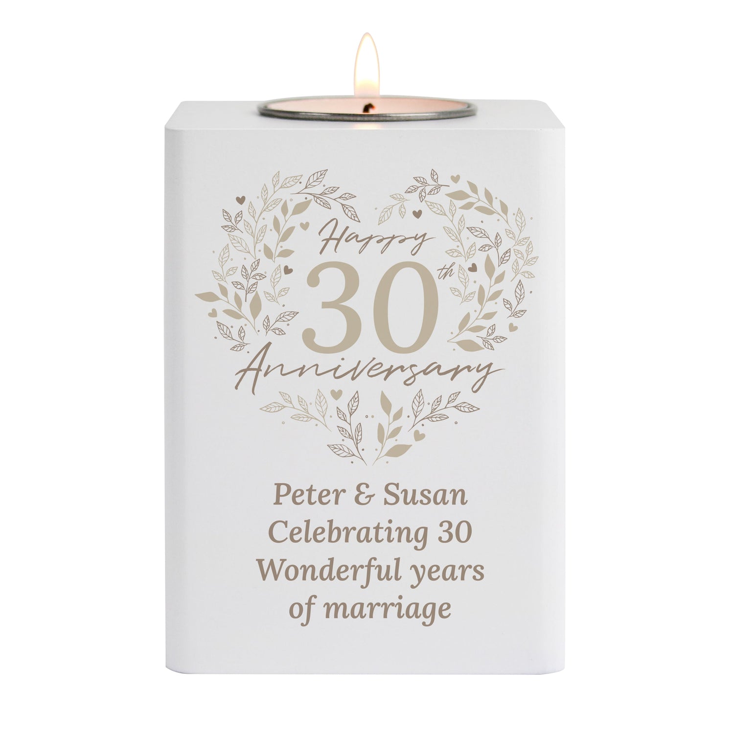 Made from painted wood with a metal tea light case, this anniversary tea light is a perfect gift or a treasured addition to your own home. Tea lights are not included. This personalised 30th pearl anniversary tea light holder makes a thoughtful and unique present.