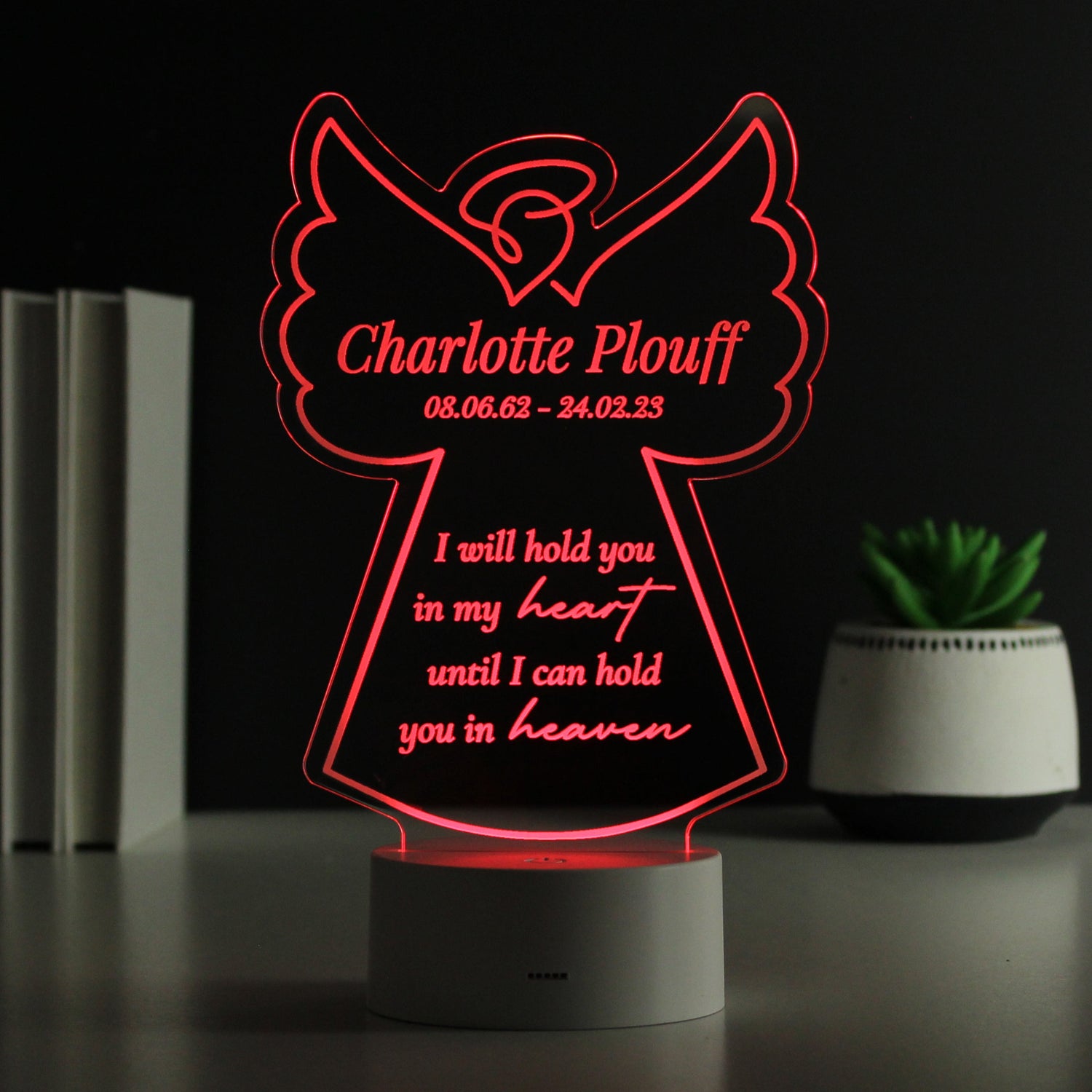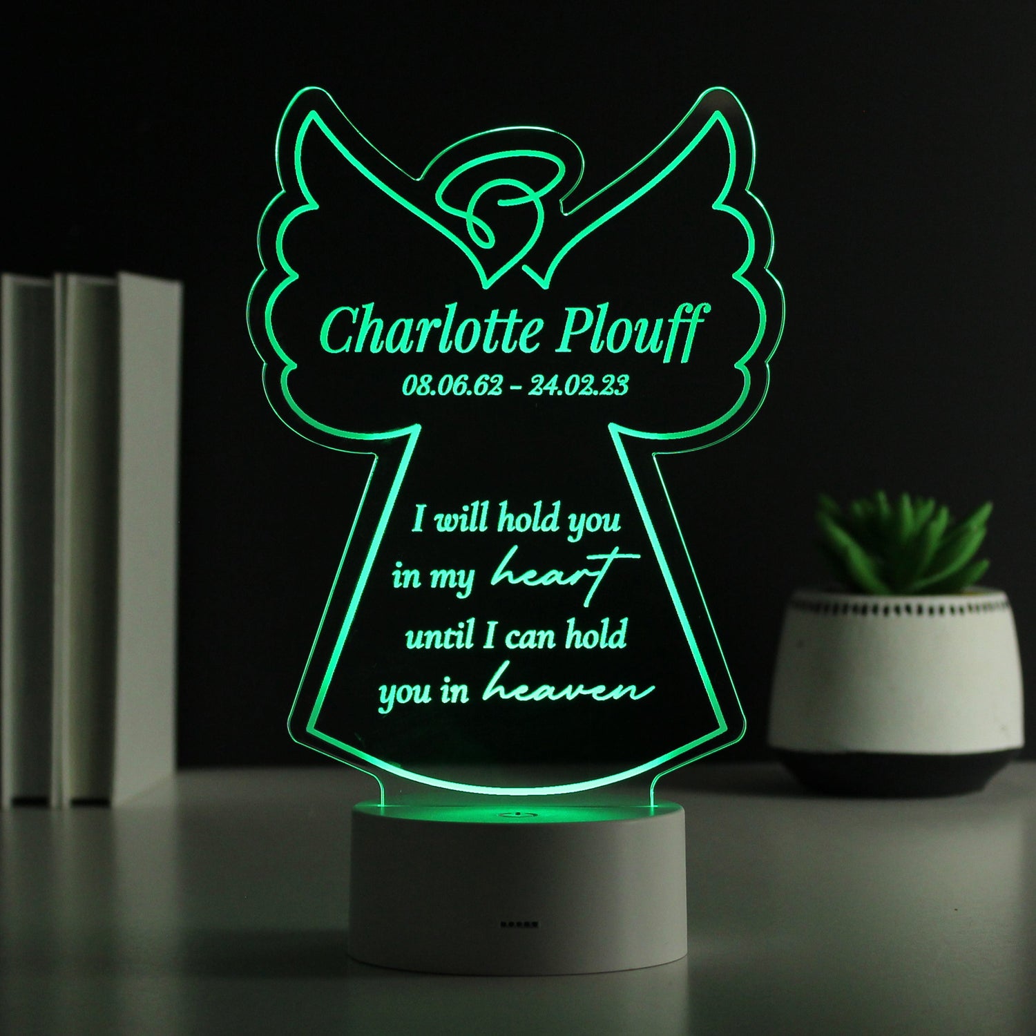 Commemorate a loved one with this personalised angel memorial LED light. This colour changing light features a touching verse: I will hold you in my heart until I can hold you in heaven. Personalise it with your own message across two lines of up to 20 characters each.