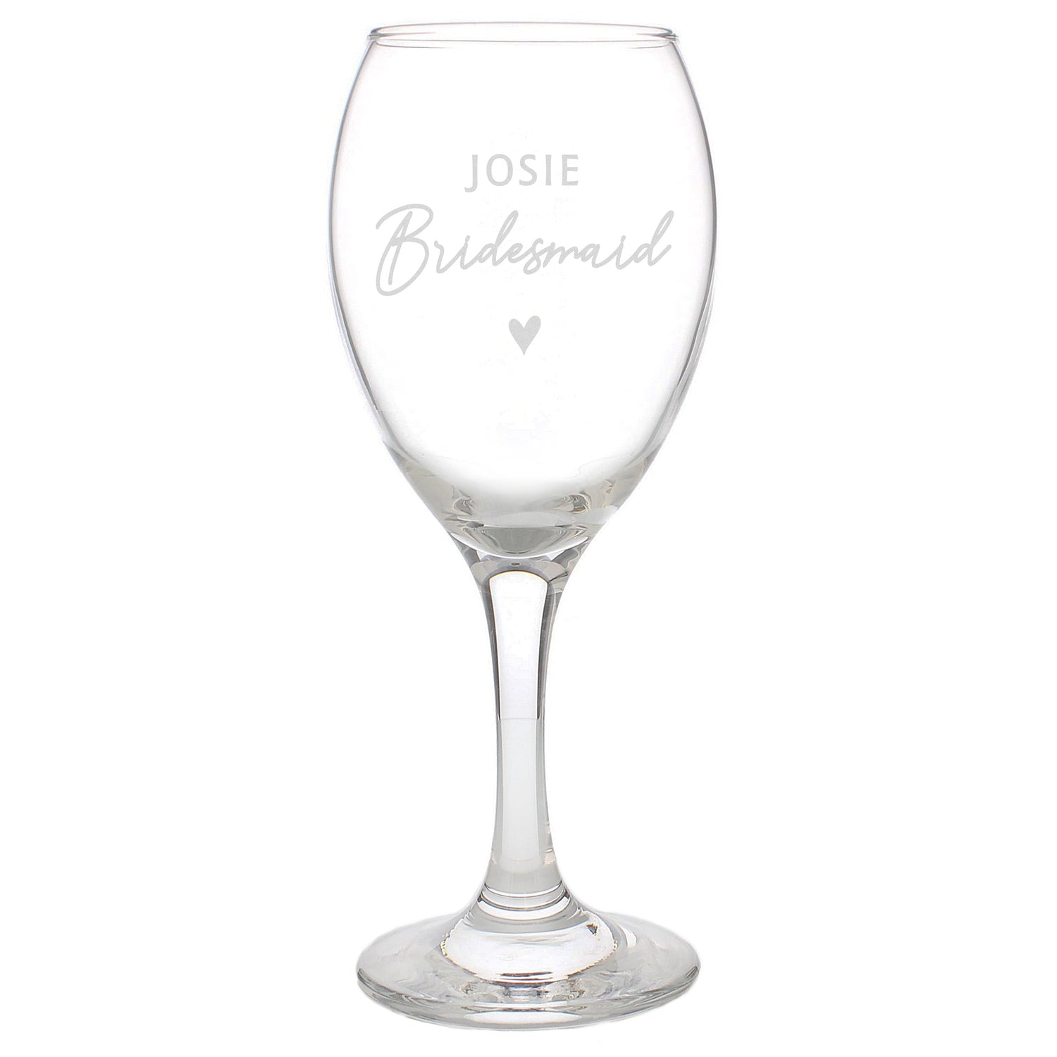 Personalise it with a name up to 12 characters long, which will appear in uppercase. Bridesmaid is included as fixed text. A wonderful bridesmaid gift or fun addition to hen party celebrations. It's a beautiful keepsake that any bridesmaid will treasure. The perfect bridesmaid wine glass for your special day.