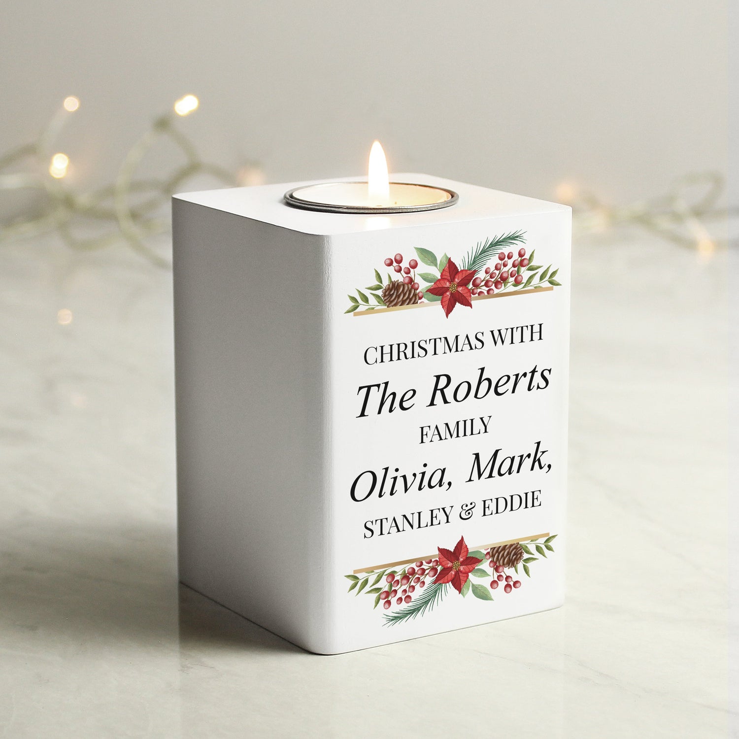 Add a personalised festive touch to your home with this white wooden tealight holder. Made from painted wood with a metal tea light case, this charming wooden tealight holder allows you to add up to five lines of personalised text.