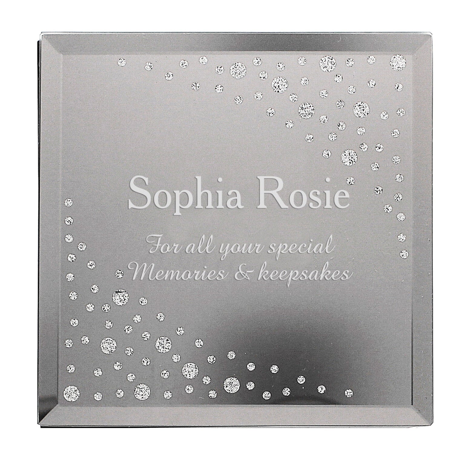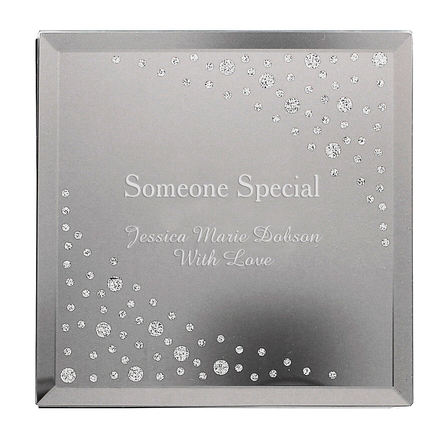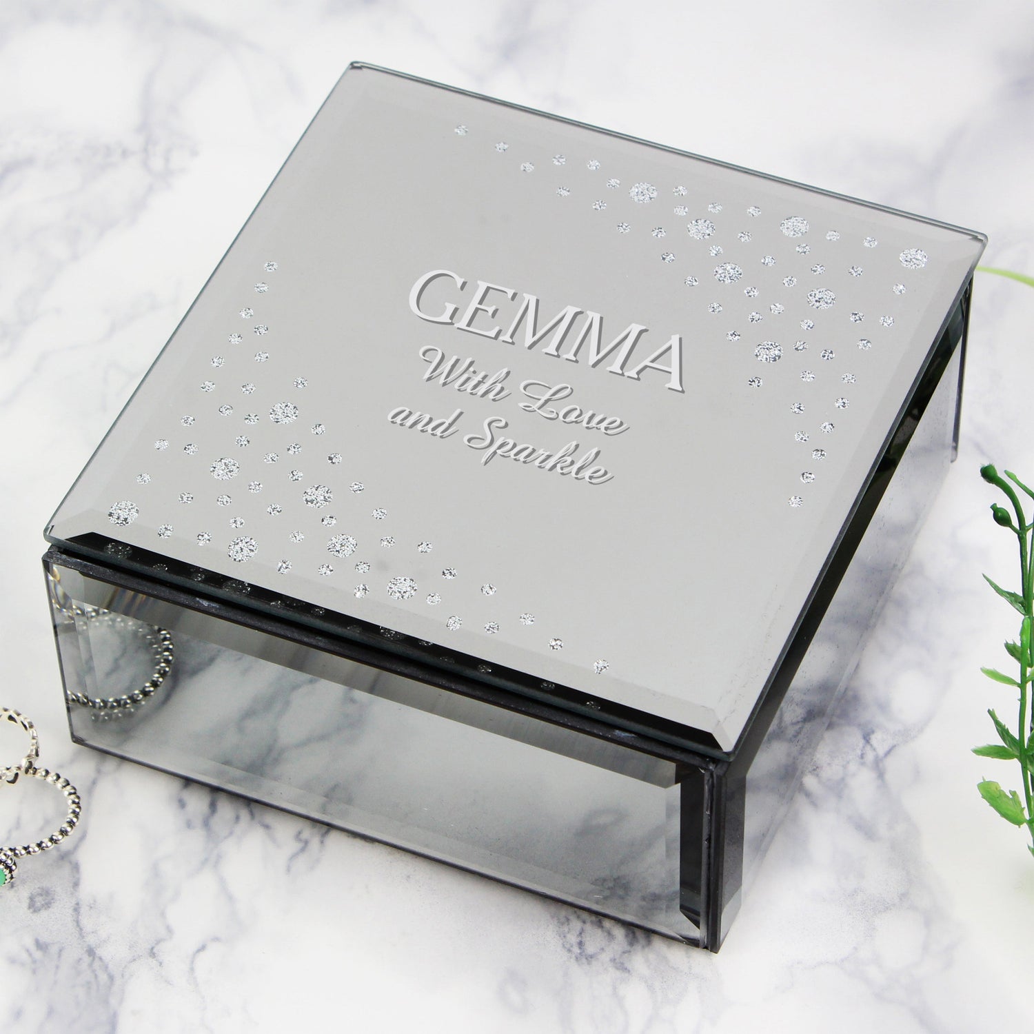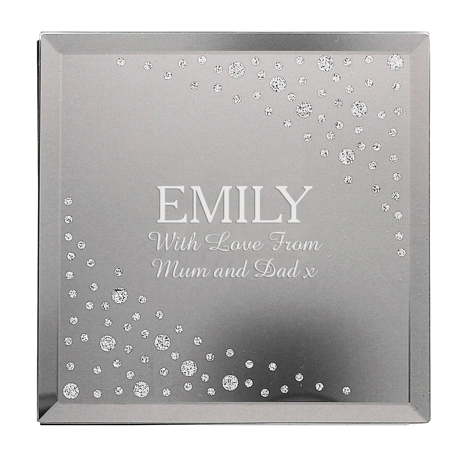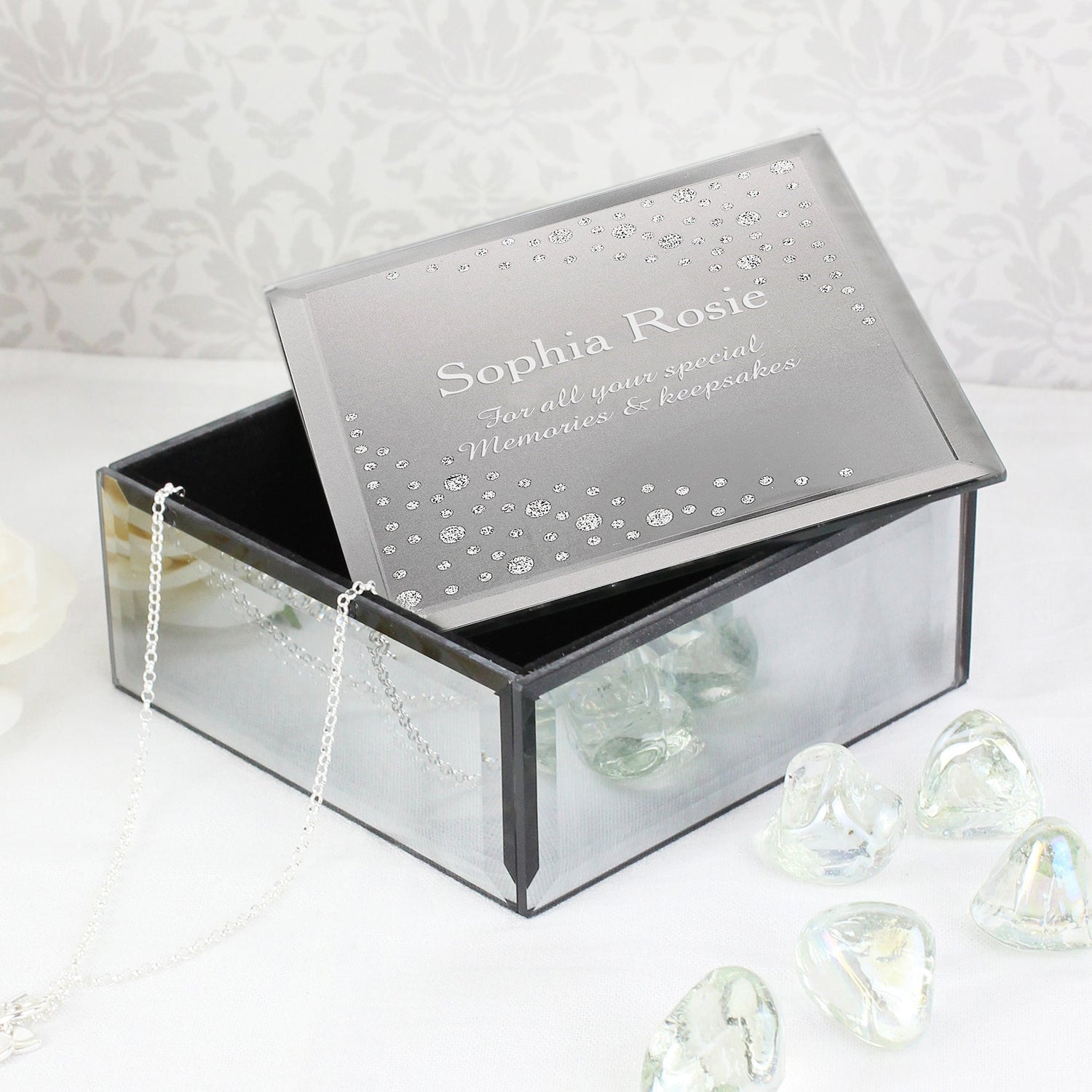 This elegant glass trinket box adds a touch of sparkle to any dressing table. Its mirrored glass surface is adorned with a beautiful diamante effect.