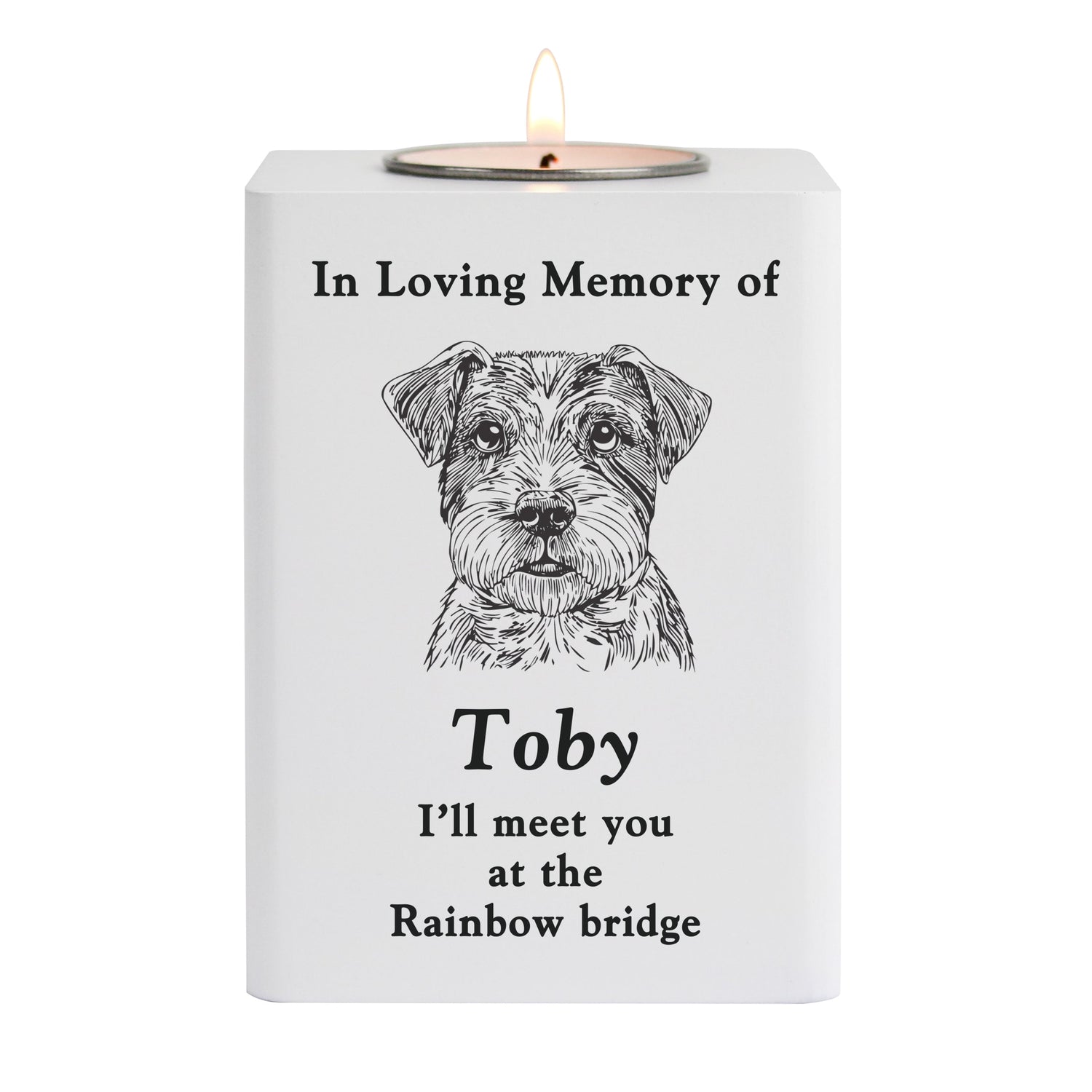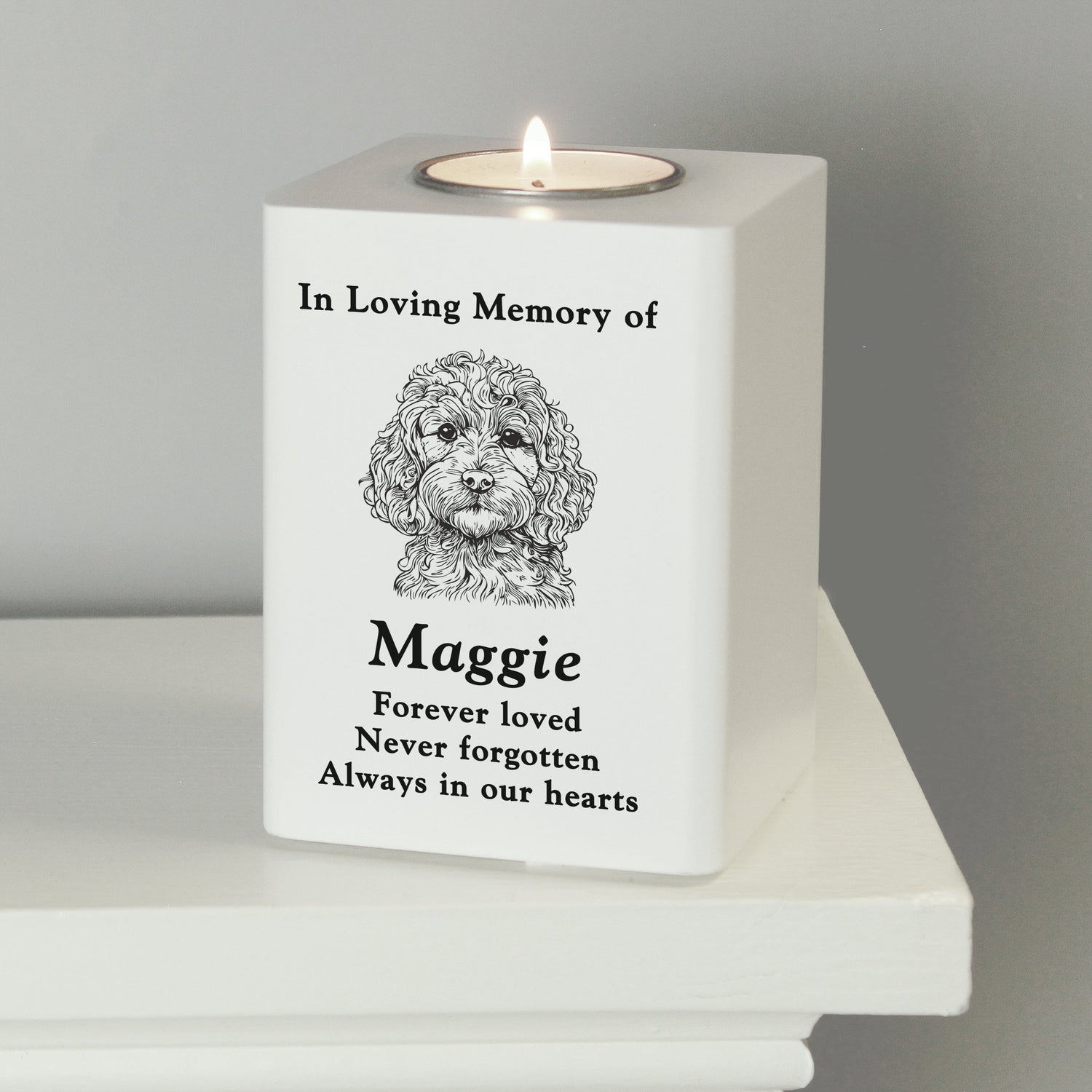 Celebrate the life of your beloved canine companion with this personalised dog breed memorial tealight holder. This beautifully crafted, painted wooden holder features a charming illustration of your chosen dog breed and space for a personal message of up to five lines.