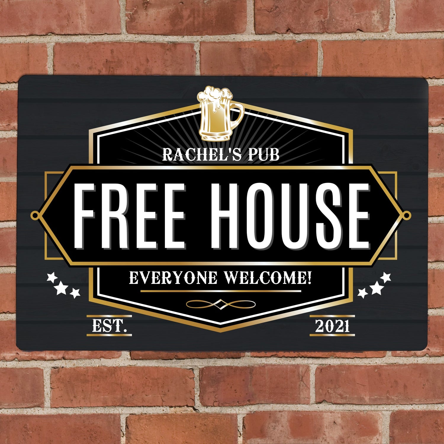 Personalise it with two lines of text, each up to 20 characters, and a year (up to 4 characters). The text will appear in uppercase. Free House & EST. are fixed elements of the design.