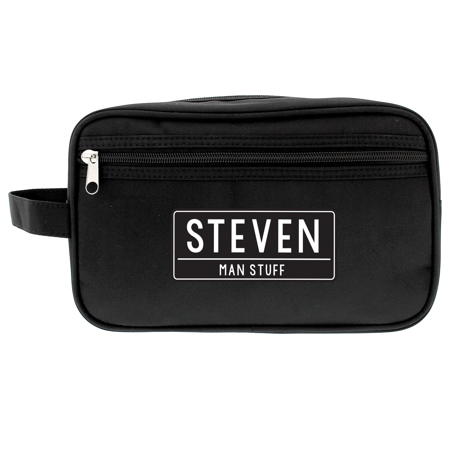 This personalised free text black wash bag is ideal for keeping your toiletries organised. Perfect for travel, this handy wash bag features a zip closure and a smaller zip-up pocket for extra storage. Personalise it with a name (up to 12 characters) and a short message (up to 25 characters) – perfect for gifts.