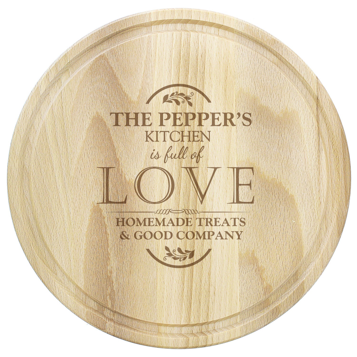 This large, personalised round chopping board is perfect for adding a touch of love to any kitchen. Personalise it with a surname (up to 15 characters) and a message (two lines of up to 20 characters each). The fixed text "Kitchen is full of love" will be included.