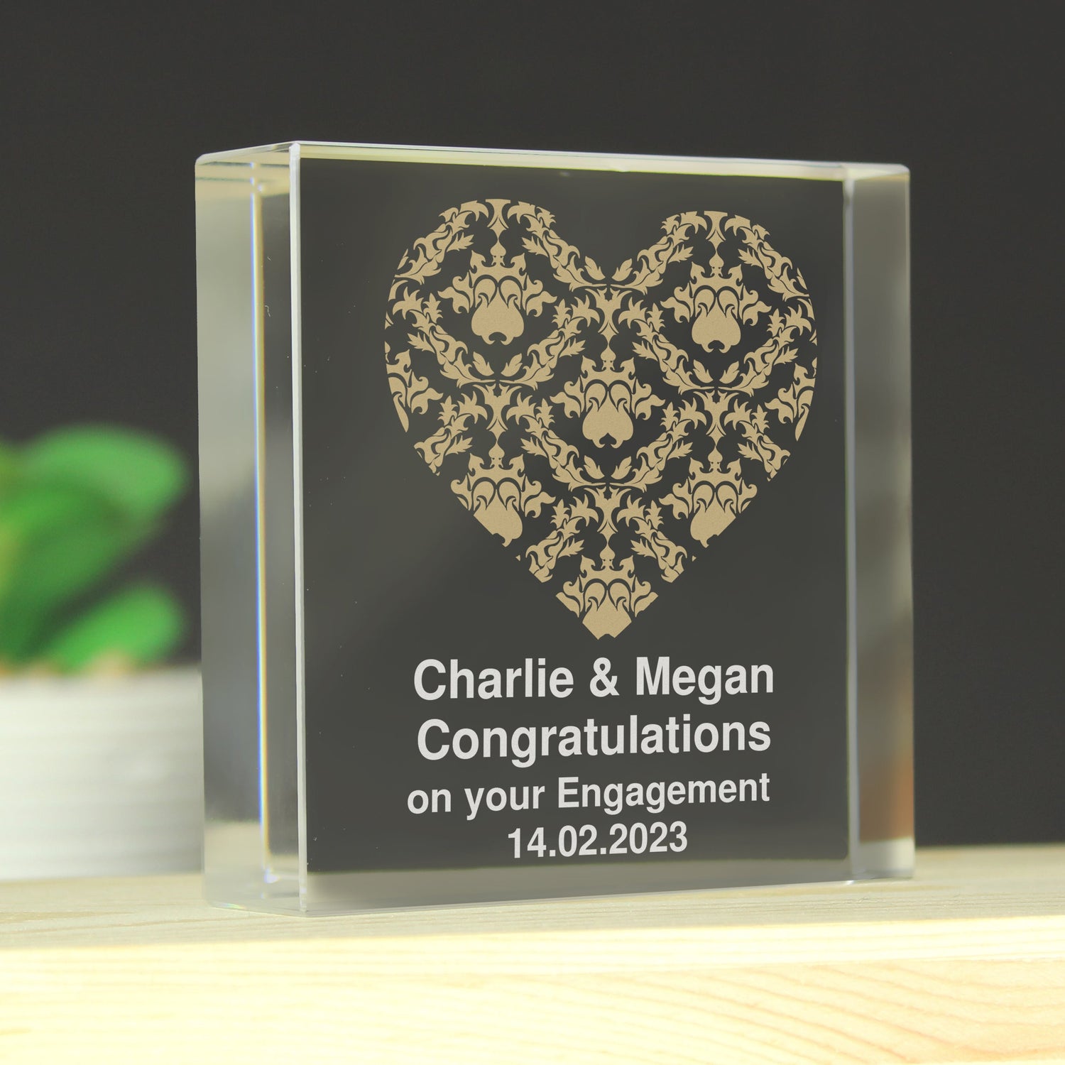 Celebrate a special occasion with this personalised gold damask heart crystal token. This elegant damask heart crystal features a gold damask design and can be personalised with a message of up to four lines, with a maximum of 25 characters per line.