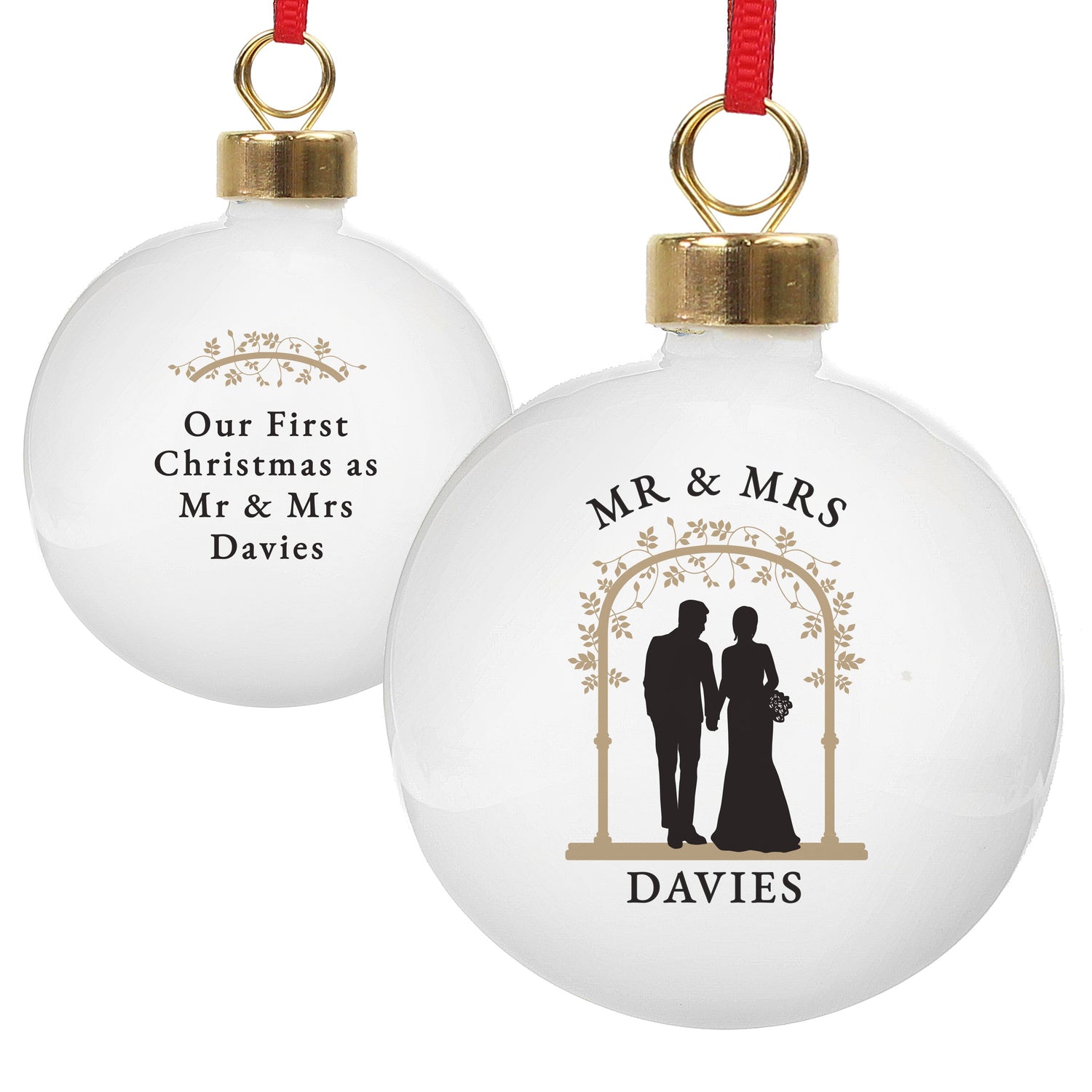 Celebrate your wedding or first Christmas together with this lovely personalised Mr & Mrs bauble. A perfect keepsake, it's also ideal as a unique wedding favour or gift.