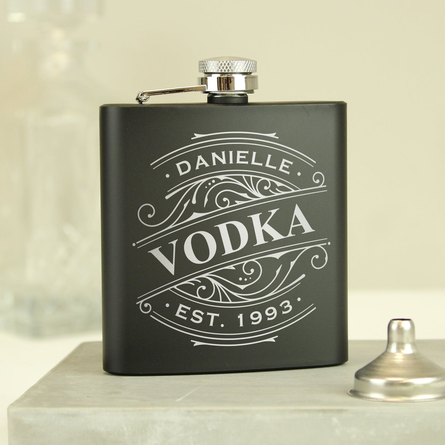 This personalised spirit black hip flask makes a thoughtful gift for any occasion. It's crafted from stainless steel and holds 6oz of your favourite spirit.