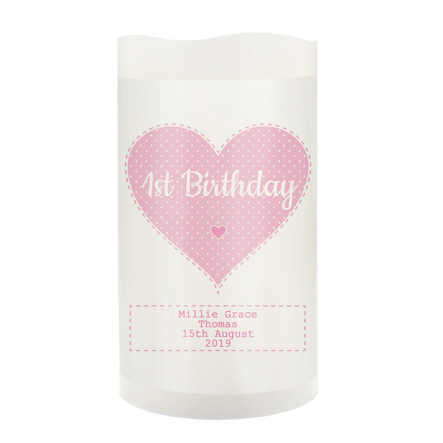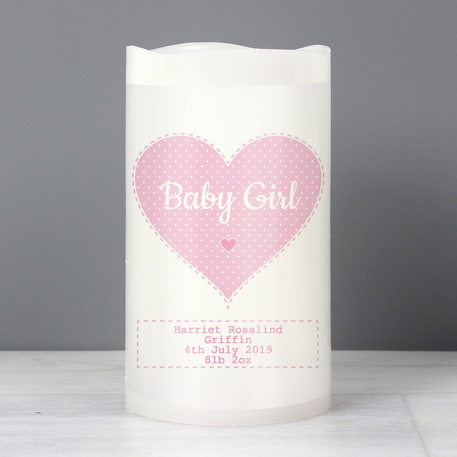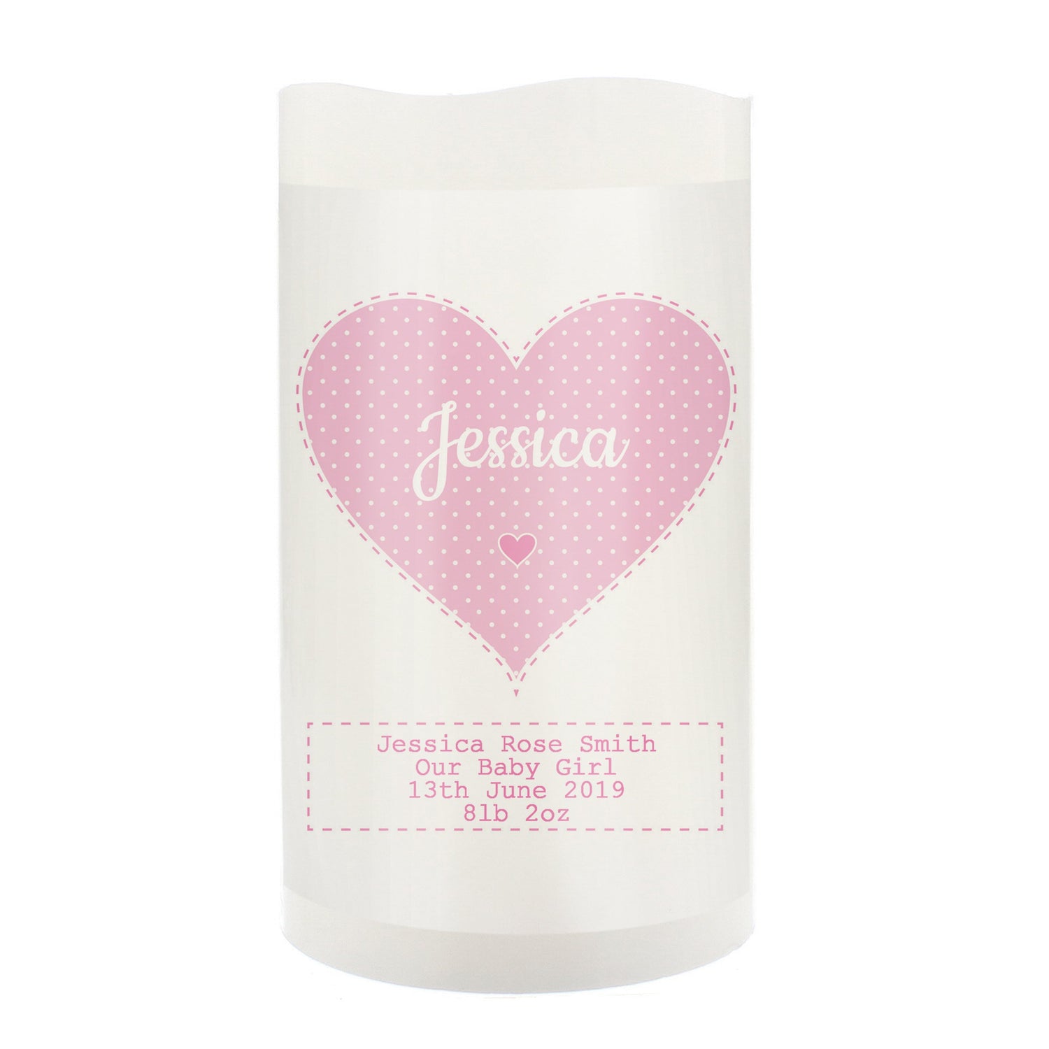 Give your little one a sweet and personalised night light with this LED candle. Perfect for a dot baby girl, this charming baby girl night light features a heart design where you can add a name or role (up to 12 characters) and a personal message over four lines.