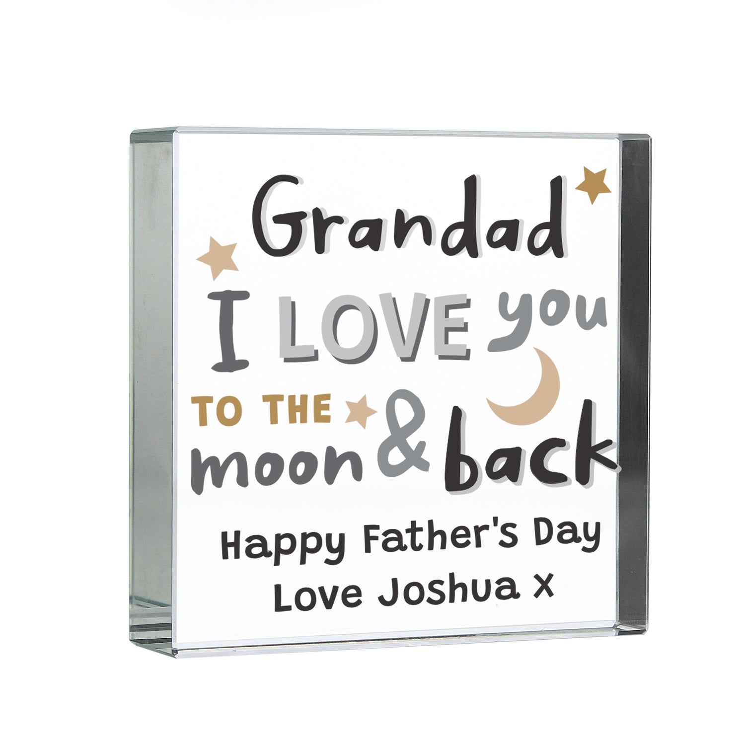 Show your love with this personalised crystal token. A perfect gift for a loved one, this charming keepsake features the phrase I love you to the moon & back, alongside a personalised name (up to 12 characters) and a short message (2 lines, 20 characters per line). All personalisation is case sensitive. This beautiful crystal token arrives ready for gifting in a black presentation box. A truly thoughtful and unique present.