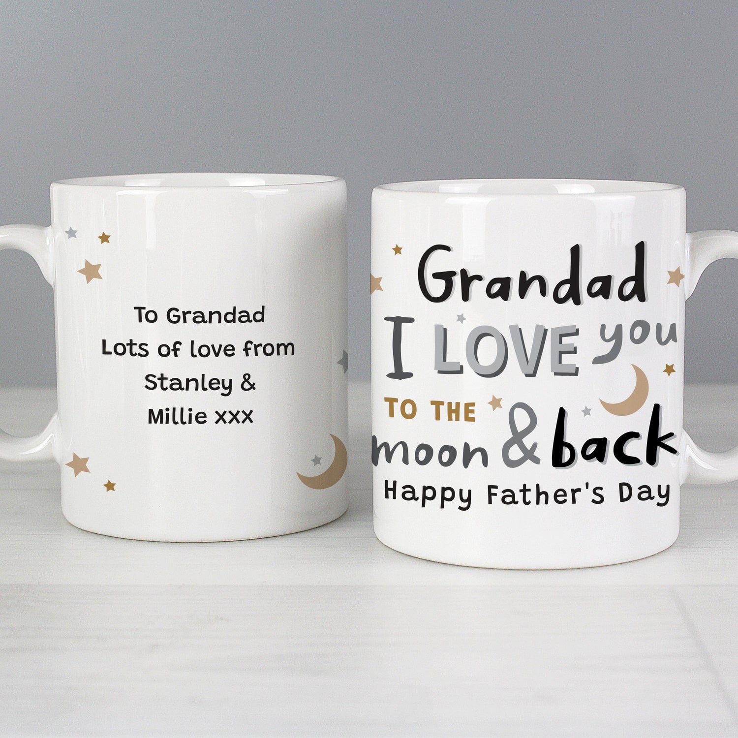 Show your love this Fathers Day or any special occasion with a personalised mug. This ceramic mug features the endearing message I Love you to the Moon and Back.